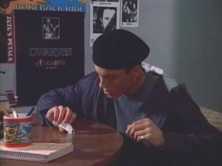 Prior to the show’s fourth season, drug abuse had been addressed before, but mostly off on the side: Kelly’s mother was an occasionally-relapsing alcoholic and cocaine user, while Dylan’s alcoholism was an established part of his character from the get-go that occasionally reared its head (such as when his father died). But “Crunch Time” marks the first time one of the central characters of the show gets embroiled in a drug abuse storyline head-on, as David gets hooked on crystal meth in order to keep up with his college workload. It’s the first of what would become several drug abuse storylines on the show, as everyone from Kelly (cocaine) to Dylan (cocaine and heroin) to Donna (prescription meds) would eventually get saddled with drug addictions.