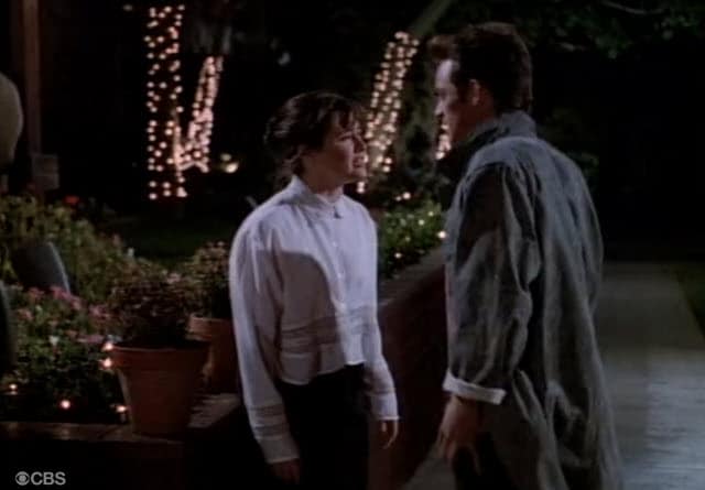 Arguably the show’s biggest cop to its soap opera roots occurred later in the third season when Dylan, long-estranged from his father Jack (Josh Taylor)—who had been jailed earlier in the series for financial crimes—is given an opportunity to reconnect with his dad thanks to an early parole and a newfound desire on Jack’s part to make up for lost time. However it turns out Jack’s release is predicated on his testifying against his old mob buddies, which leads to Dylan’s reunion with his father being tragically cut short when Jack is seemingly killed by a car bomb. It’s outlandish and over-the-top (Luke Perry literally falls to his knees in the scene, clenching his fists in sorrow and rage), but it is memorable, and the creative team wisely gives the event its due, making the act of grieving for Dylan a plot point over the course of several episodes rather than quickly blowing past it.