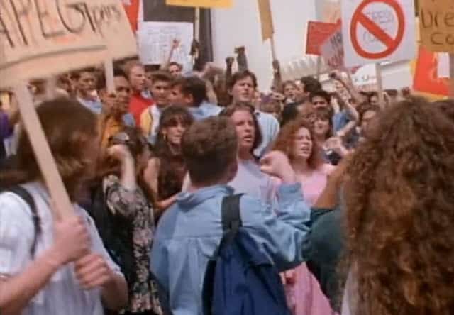 In the process, the episode makes both subtle and overt allusions to the protest era of the ’60s and the Vietnam War. To adults, their protest comes across as deeply ridiculous, the allusions to the protests against Vietnam only heightening that sense, as the teens’ argument essentially boils down to, “our friend knowingly broke a rule, but she’s really nice and our friend, so she doesn’t deserve to be punished” (the continued arguments for Donna’s inherent goodness in this episode is also made more eye-rolling when recalling that she’s played by series creator Aaron Spelling’s daughter), which is in no way an approximation of the issues surrounding the protests of the ’60s. But to adolescents watching at the time, chants of “Donna Martin graduates!” gave a sense of righteous indignation, cheering from home as their favorite characters stood up against the perceived oppressions of the adult world.