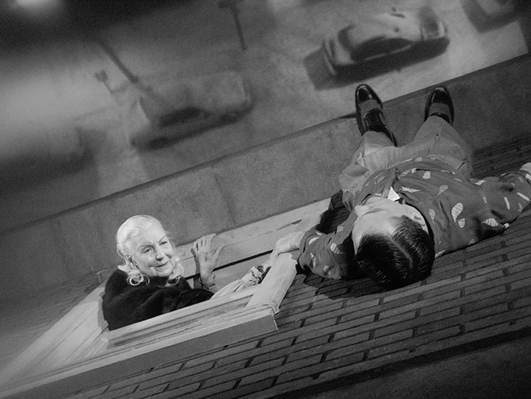 In the course of a far too brief 80 minutes, Maddin discusses the geographical anomalies of Winnipeg, as well as the unusual, yet integral, moments that have shaped his city: worker strikes and elderly ladies locking arms to save a tree; horses frozen in a river, their heads jutting through the ice like twisted animal pillars; alleyways, waterways, and railways; hockey, of course hockey; and perverse “Golden Boy” contests. More intimately, and with the help of actors standing in for his family (Ann Savage, of Detour fame, playing his mother), Maddin also recalls familial drama and childhood anxieties. Everything is told as an exaggerated reminiscence, like in Woody Allen’s Annie Hall, to draw another cinematic comparison. And everything is shown in a jittery, dizzying montage that characterizes Maddin’s filmmaking style: rapid editing, fast/slow motion, blurred focus, superimposition, a fluid camera, stock footage, you name it. Through the relentlessly convulsive incorporation of spasmodic imagery and text, Maddin ties together any number of the film’s various segments to create a mythological medley of connectivity and causation.