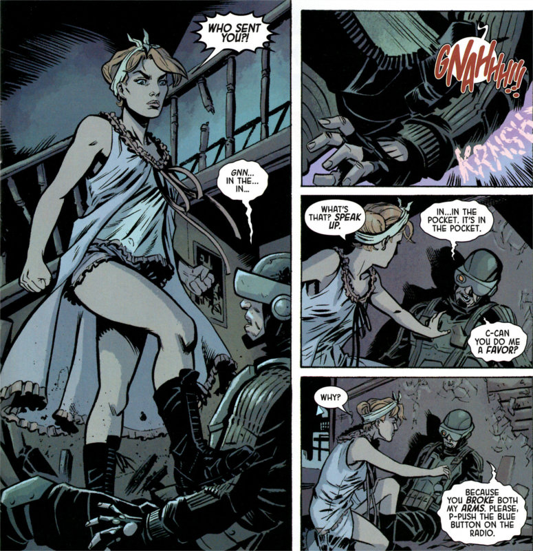 Rich Ellis’ artwork falls right in tone with Immonen’s military/spy/sci-fi mash up. His style reminds one of a cruder Darwyn Cooke albeit with some muddier colors. He blends his sound effects in well with the background which really helps his style pop in action scenes. Ellis can go from gritty bullet ridden bedrooms to sickly alien weaponry and have it all come together.