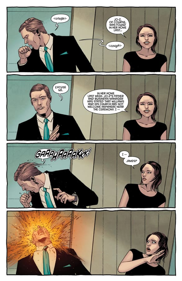 The art is detailed and realistic. Much like a Cronenberg film, Haun captures the monotonous, plain environments of urban cities. Also like Cronenberg, the gory bits are quite effective. The head explosions caused by the Beauty are fairly violent. Even more disturbing are the resulting corpses. Despite their gray and decayed state, they remain attractive. It’s unnerving and the implications of the attraction are best left to Freud. Some readers might not be fond of the art, not because it is bad, but there is nothing special about it outside of it being detailed and realistic.
